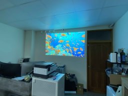 此案因建築造型關係使得投影機投影距離需達11米,在限制投影大小為100吋左右時,